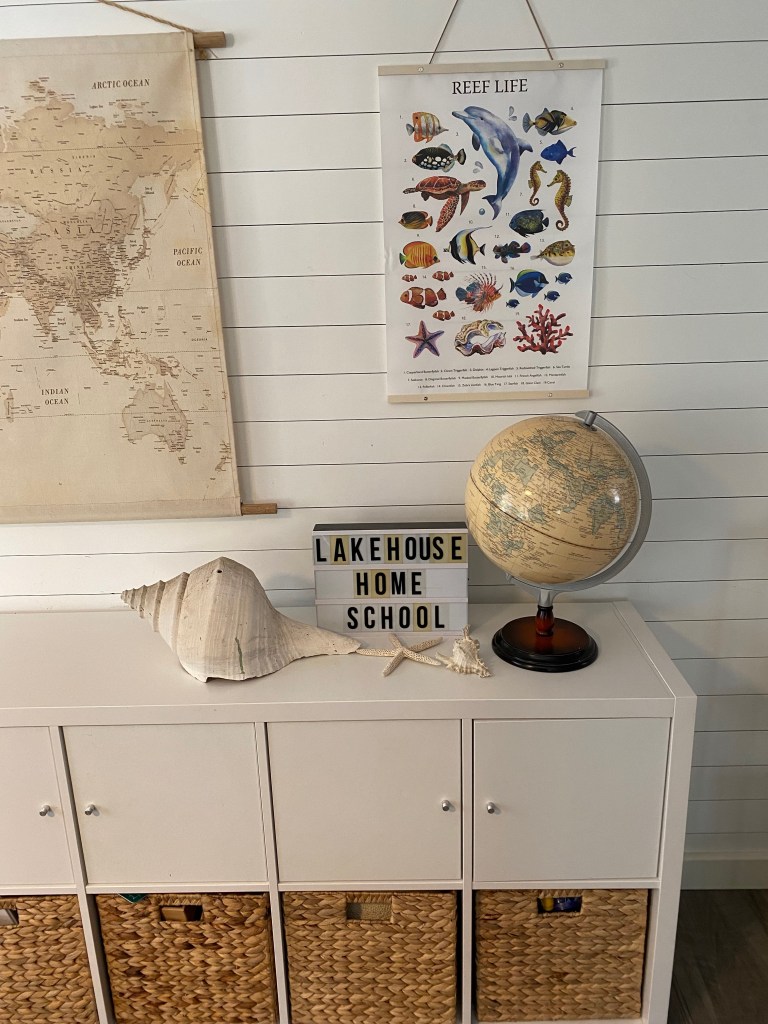 This year we started our year off doing an Oceans Unit Study from Gather Round Homeschool so I decorated our space with ocean themed decor. We live by the sea so we have a vast collection of seashells, sea stars and sea bird feathers. I purchased these beautiful ocean themed posters from Kmart Australia and my children love them.