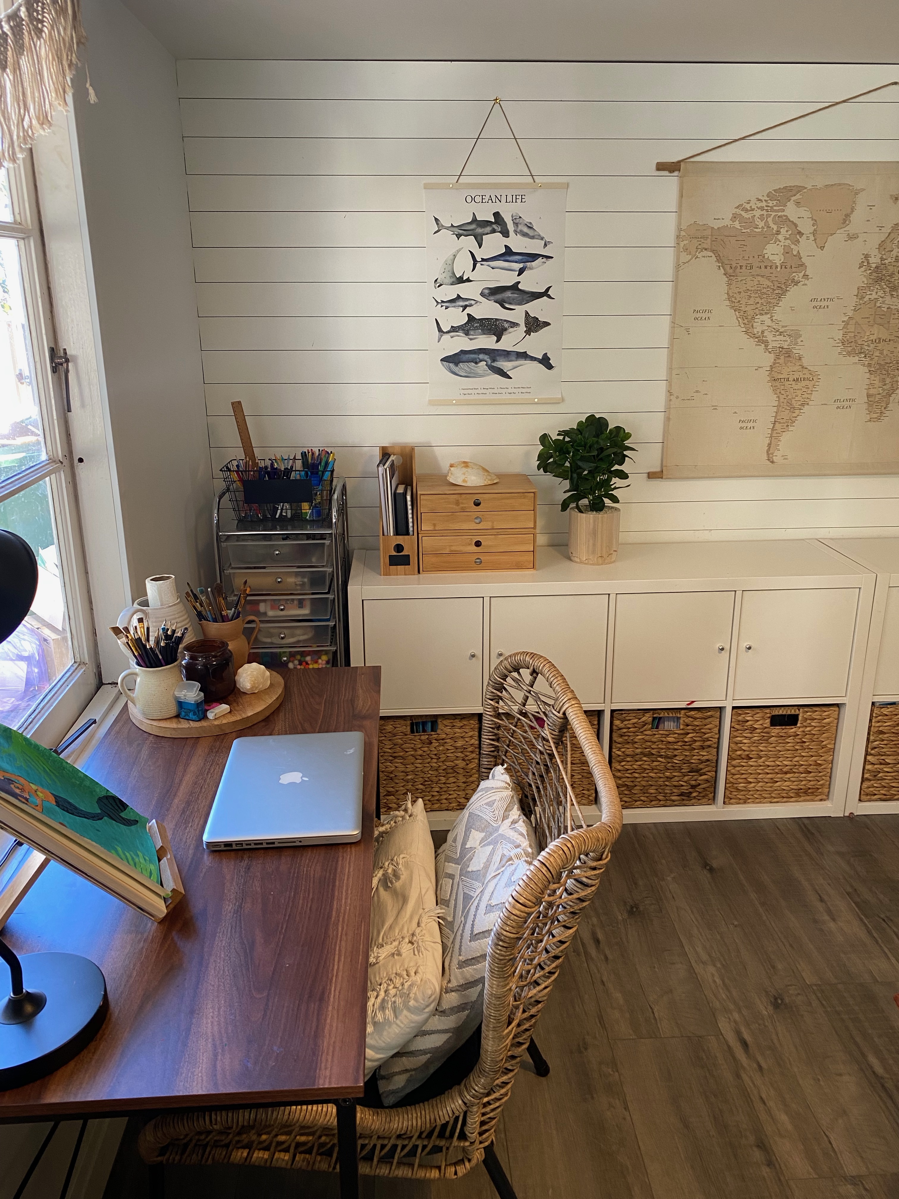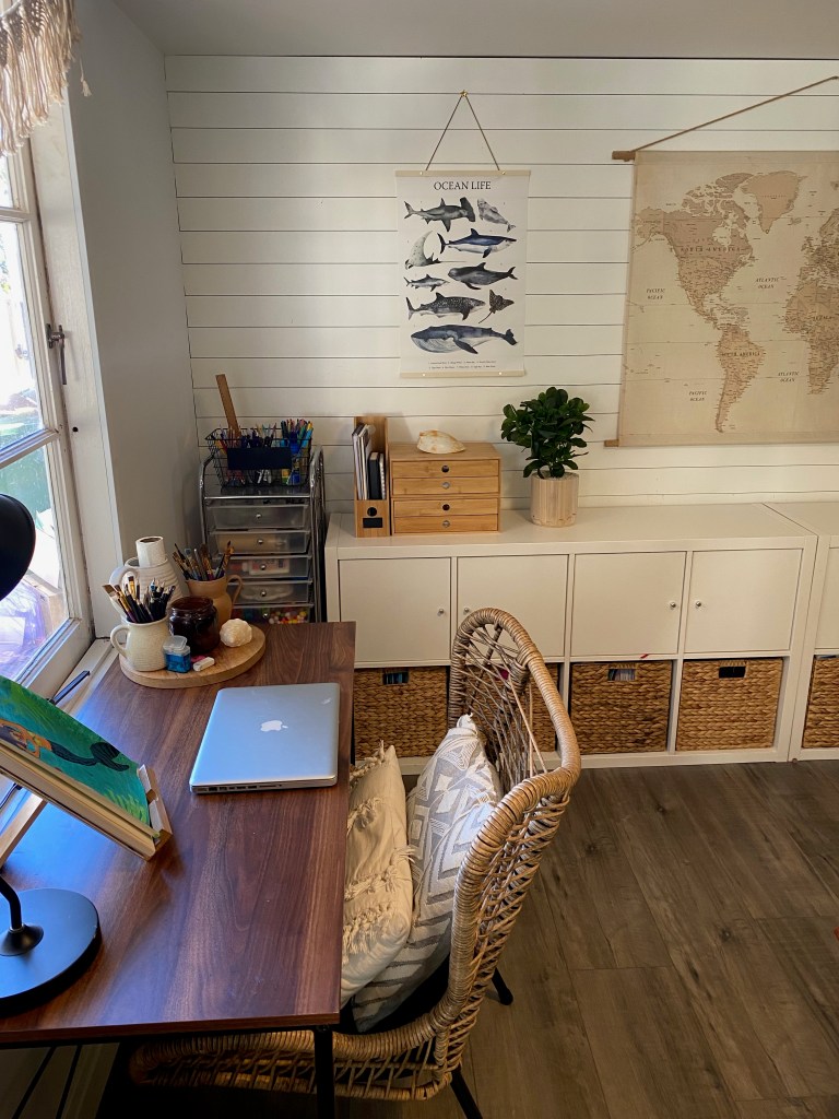 I also included a little space just for me. I set up this little corner of the room for me to do my artwork. I have everything I need with in reach to sit down and take some time for myself to draw and paint. My children have all their art supplies located in the draws you can see located in the corner. The draws hold all of the bits and pieces that they need to create beautiful masterpieces, paint and paint brushes, watercolours, paper, glue, feathers, pop sticks, goggly eyes and so much more. They simply pull out the trolley of draws from the corner and wheel it to the table and create until their little hearts are content.